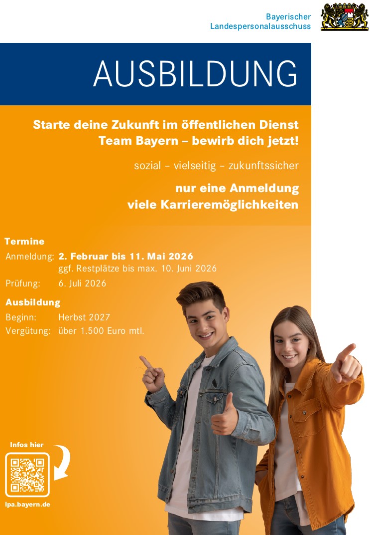 Weitere Informationen zu Inhalt, Ablauf und Gültigkeitsdauer der Auswahlverfahren sowie den Berufsfeldern finden Sie unter Ipa.bayern.de oder auf dem Karriereportal unter Ihr Einstieg > in der Ausbildung > Nichttechnische Ausbildungsberufe bzw. Ihr Einstieg > für ein duales Studium > Nichttechnische Studiengänge.